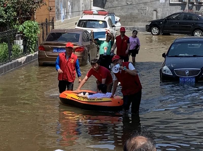 3、李沅鴻領隊12人出動2輛鏟車、2艘橡皮船、2輛班車、1輛集裝箱車水中救援職工及其家屬和受災群眾,運送至銀金達安置點,并參加李良屯護堤防汛;