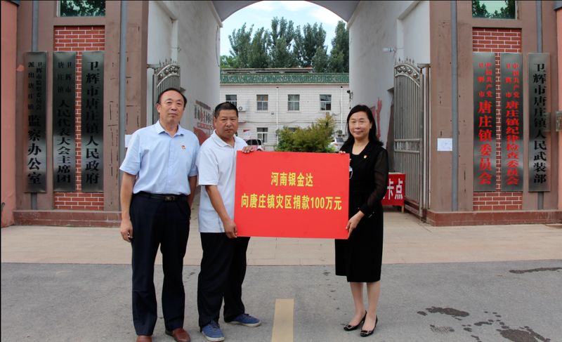 黨委書記、董事長閆銀鳳代表河南銀金達集團向唐莊鎮人民政府捐資100萬元;
